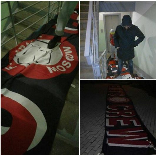 Peu après ça, quelques photos circulent sur les Internet. On apprend alors que des supporters du CSKA Moscou ont réussi à voler la bannière du Flint’s Crew. Un énorme coup des hooligans du CSKA. En effet, le Flint’s Crew est le plus vieux groupe hooligan du Spartak Moscou. Un groupe avec une histoire longue comme le bras et grandement respecté pour son histoire et ses actions. Un groupe qui pèse son poids dans le monde hooligan en Russie et qui a fait développer le mouvement à travers, notamment, son zine, qui décrivait l’actualité du monde ultra et hooligan en Russie, informait avec détail sur les déplacements des supporters du Spartak et sur les derbys. Bien que le groupe ne soit plus actif depuis 2010, une bannière du Flint’s Crew reste un trophée représentant un certain pan de l’histoire du monde des tribunes en Russie.
